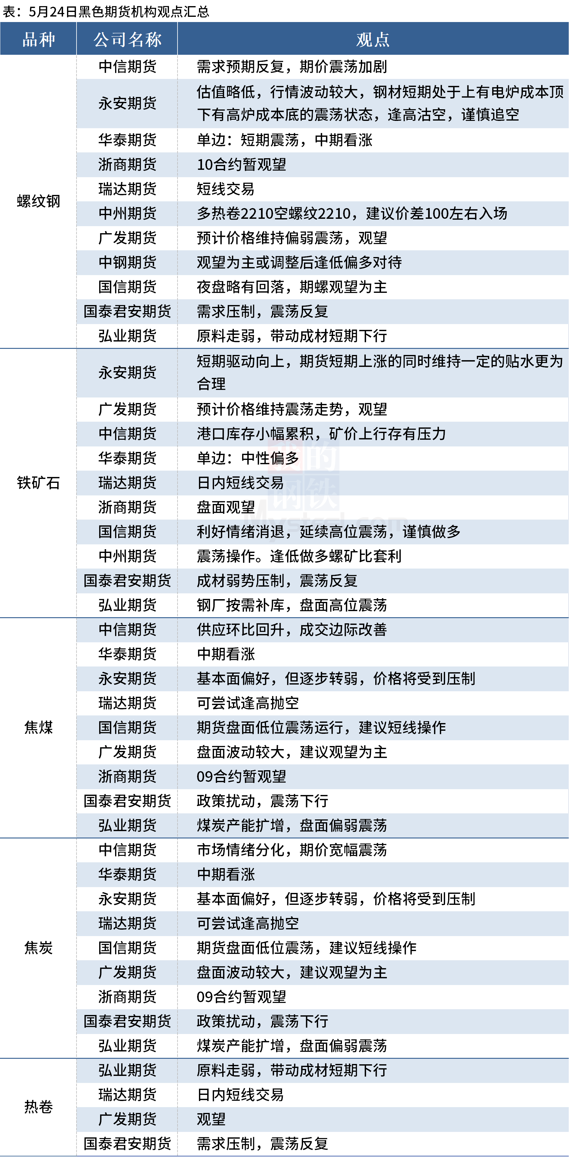 据Mysteel统计5月24日11家期货组织操作策略,其中多数组织建议螺纹钢观望为主,预计铁矿石延续震荡,焦煤、焦炭偏弱震荡。具体汇总内容如下: