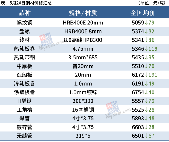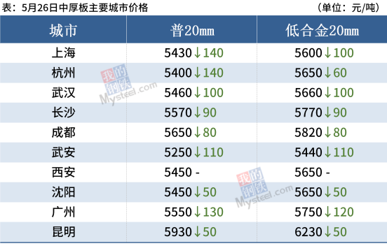 中厚板:5月26日,全国24个主要城市20mm普板均价5510元/吨,较上个交易日价格下跌70元/吨。今日现货价格继续下跌,期货大幅下挫,下游用户采购不佳,整体成交较差,商家心态悲观,多数商户日成交维持偏差水平。心态方面,对于后市来说,商家多是采取套现为主销售模式,对于后期市场持谨慎态度。