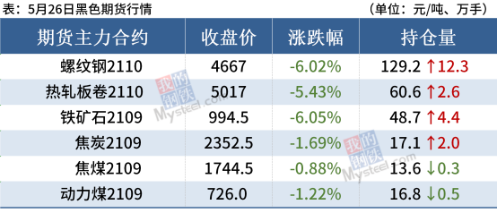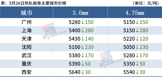 热轧板卷:5月26日,全国24个主要城市4.75mm热轧板卷均价5346元/吨,较上个交易日下跌119元/吨。今日黑色商品期货大幅走弱,现货市场报价陆续在下跌,恐慌情绪加剧,跌后现货低成本资源的利润打的差不多了,且托盘公司都在追加保证金,后期市场不排除出现资金紧张的情况,但也不必过分恐慌,当前政策和基本面都不支持价格过分走低,所以探底后可能维稳震荡缓慢回升。