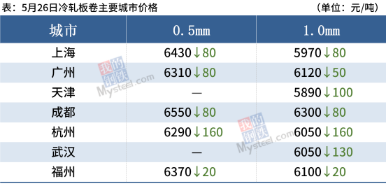 冷轧板卷:5月26日,全国24个主要城市1.0mm冷卷均价6191元/吨,较上个交易日跌49元/吨。黑色期货大幅走跌,午后钢市跌势有所放大,冷轧局部市场价格二次跌价。据商户反馈,实际成交仍不理想,受成本偏高以及短期看空预期影响,冷轧期货钢厂订单减少。从下游看,多按需采购为主,开空情绪尚存,逢低少量补货。