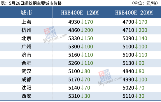 建筑钢材:5月26日,全国31个主要城市20mm三级抗震螺纹钢均价5059元/吨,较上个交易日下跌79元/吨。具体来看,期螺再次大幅下挫,上午国内多数地区建筑钢材价格延续跌势,并且跌幅扩大。从成交来看,市场观望情绪蔓延,下游采购意愿较弱,整体成交明显下滑。