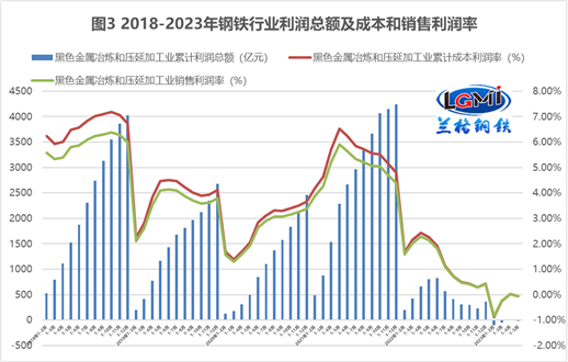 从全国粗钢产量及吨钢利润的数据来看,国内钢铁生产企业的利润恢复进程被打破(详见图1),综合成本展现出了非常强的韧性(详见图2),由于钢材价格的先扬后抑,而原料价格的韧性显现,使得钢企的利润空间触顶回落(详见图3),钢铁生产企业面临着成本韧性与需求不足的双重挤压。