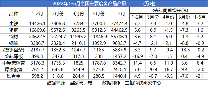 表1 2023年全国主要冶金产品产量