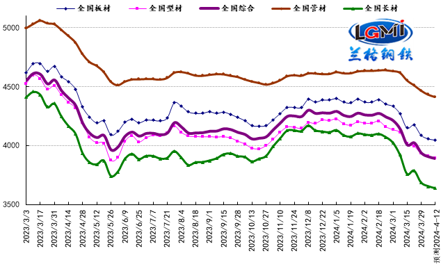 2024年第14周(2024.4.1-4.7)兰格钢铁全国绝对价格指数为3909元,较上周下降1.1%,较去年同期下降12.5%。其中,兰格钢铁长材绝对价格指数为3654元,较上周下降1.1%,较去年同期下降14.0%;兰格钢铁型材绝对价格指数为3912元,较上周下降0.9%,较去年同期下降11.7%;兰格钢铁板材绝对价格指数为4059元,较上周下降1.2%,较去年同期下降11.5%;兰格钢铁管材绝对价格指数为4432元,较上周下降0.9%,较去年同期下降11.0%。